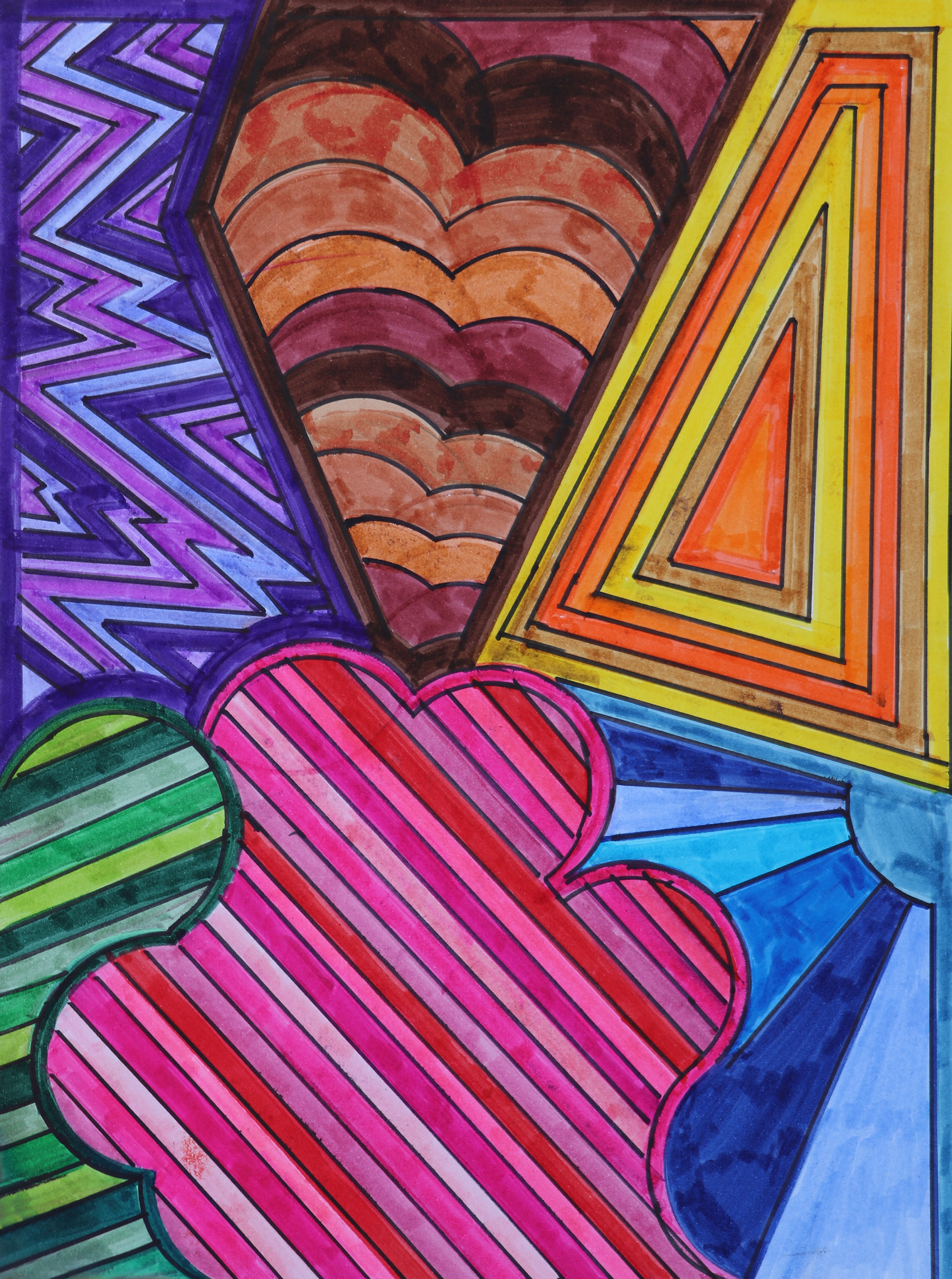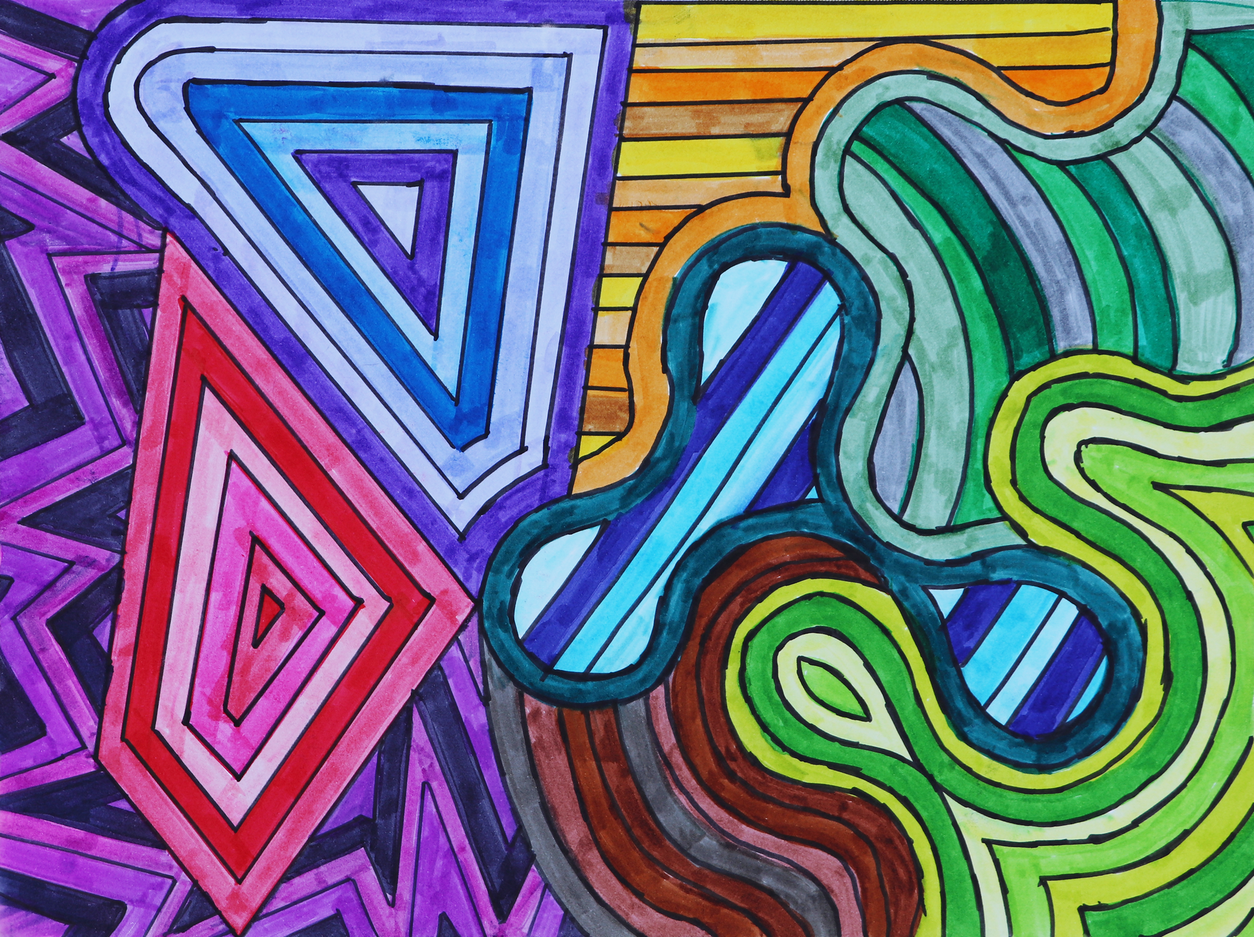One night, as my kids fell asleep across the hall, I found myself drawing and doodling in bed: clear, straight lines with distinct boundaries, simple patterns, and bright colors. This style of drawing was incredibly therapeutic. That one night turned into many until it became a part of my bedtime routine. I continue to doodle at night.